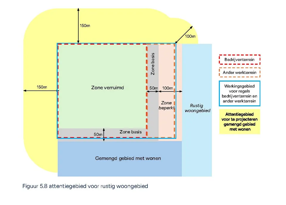 De systematiek van milieuzonering die in de handreiking wordt voorgesteld, is behoorlijk technisch en daarmee lastig te doorgronden. Voor de goede orde wordt daar op deze plaats een kort overzicht van gegeven. Voor het aspect geluid wordt in de handreiking de volgende regeling gehanteerd. Als basiswaarde voor geluid wordt in de handreiking gekozen voor een waarde van 50 dB(A) op een afstand van 50 meter van de activiteit.26 Deze basiswaarde geldt in beginsel voor het gehele bedrijventerrein en ongeacht het type bedrijf waarom het gaat. Deze zonering kan volgens de handreiking worden aangevuld met een zone ‘geluid verruimd’ op een grotere afstand van een gemengd gebied met wonen.27 Binnen deze zone geldt voor de basiswaarde van 50 dB(A) een afstand van 100 meter, of de afstand tot de rand van de zone als die afstand korter is, tot een minimum van 50 meter.28 De handreiking noemt ook de mogelijkheid voor een zone ‘geluid beperkt’. Die zone biedt bescherming aan een rustige woonwijk. Binnen de zone ‘geluid beperkt’ wordt de basiswaarde aangescherpt tot 45 dB(A) op 50 meter afstand, of op de grens van de rustige woonwijk als die afstand korter is.29 In de handreiking wordt aan de hand van voorbeelden uitgewerkt hoe deze verschillende zones op elkaar inwerken. Voor geur bevat de handreiking een vergelijkbare regeling. Hierbij wordt een maximale geurbelasting voorgeschreven op een afstand van 50 meter van de milieuhinderlijke activiteit.30 Daaraan kan volgens de handreiking een zone ‘geur verruimd’ worden toegevoegd, waarbinnen de basiswaarde wordt gekoppeld aan een grotere afstand. In aanvulling op deze geluid- en geurzonering wordt in de handreiking geadviseerd om in het omgevingsplan te voorzien in een attentiegebied langs een bedrijventerrein, waarbinnen wordt verboden om nieuwe geluid- of geurgevoelige gebouwen te bouwen of na een gebruikswijziging in gebruik te nemen.31