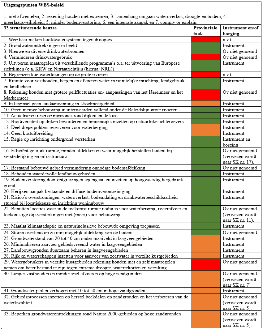 In figuur 1 staat per samengevatte structurerende keuze aangegeven of deze een relatie heeft met de provinciale taakopvatting (groen = ja; rood = nee en oranje = alleen relevant voor bepaalde provincies), zoals beschreven in paragraaf 3.2, zodat daarover eventueel regels gesteld kunnen worden in de omgevingsverordening, en of de omgevingsverordening volgens de Borgingskalender een instrumentele functie of borgingsfunctie heeft.[61]